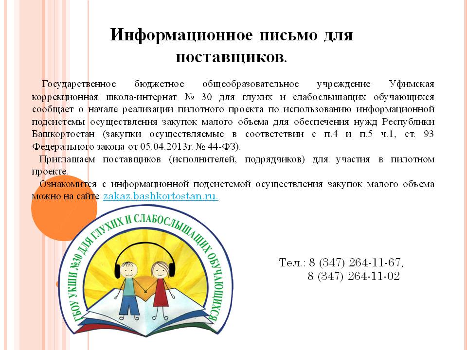Государственное бюджетное общеобразовательное учреждение Уфимская коррекционная школа-интернат № 30 для глухих и слабослышащих обучающихся является образовательным учреждением, реализующим конституционные права граждан с ограниченными возможностями на получение доступного образования на основе усвоения адаптированных основных общеобразовательных программ (далее - АООП) с учетом их особенностей, психофизического развития и индивидуальных возможностей.