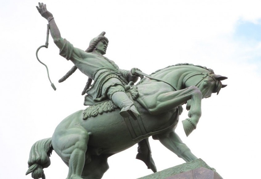 На самой высокой точке города Уфы, на утесе, возвышающемся над рекой Белой, стоит величественный монумент. Привстав на стременах и могучей рукой натянув поводья, всадник осадил разгоряченного коня. Смелое и волевое лицо, правая рука с плетью-камчой, поднятая в призывном движении. Это национальный герой башкирского народа Салават Юлаев.